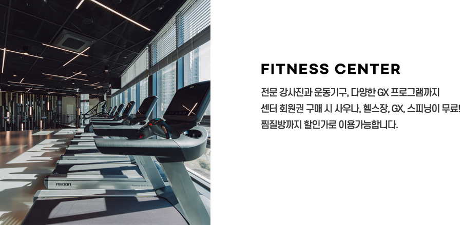 • 스파에서 즐기는 운동의 맛! 전문강사진과 운동기구 다양한 프로그램까지! 센터 회원권 구매시 사우나, 휘트니스, GX, 스피닝을 자유롭게 이용가능하며, 찜질방까지 할인가로 이용할 수 있습니다.