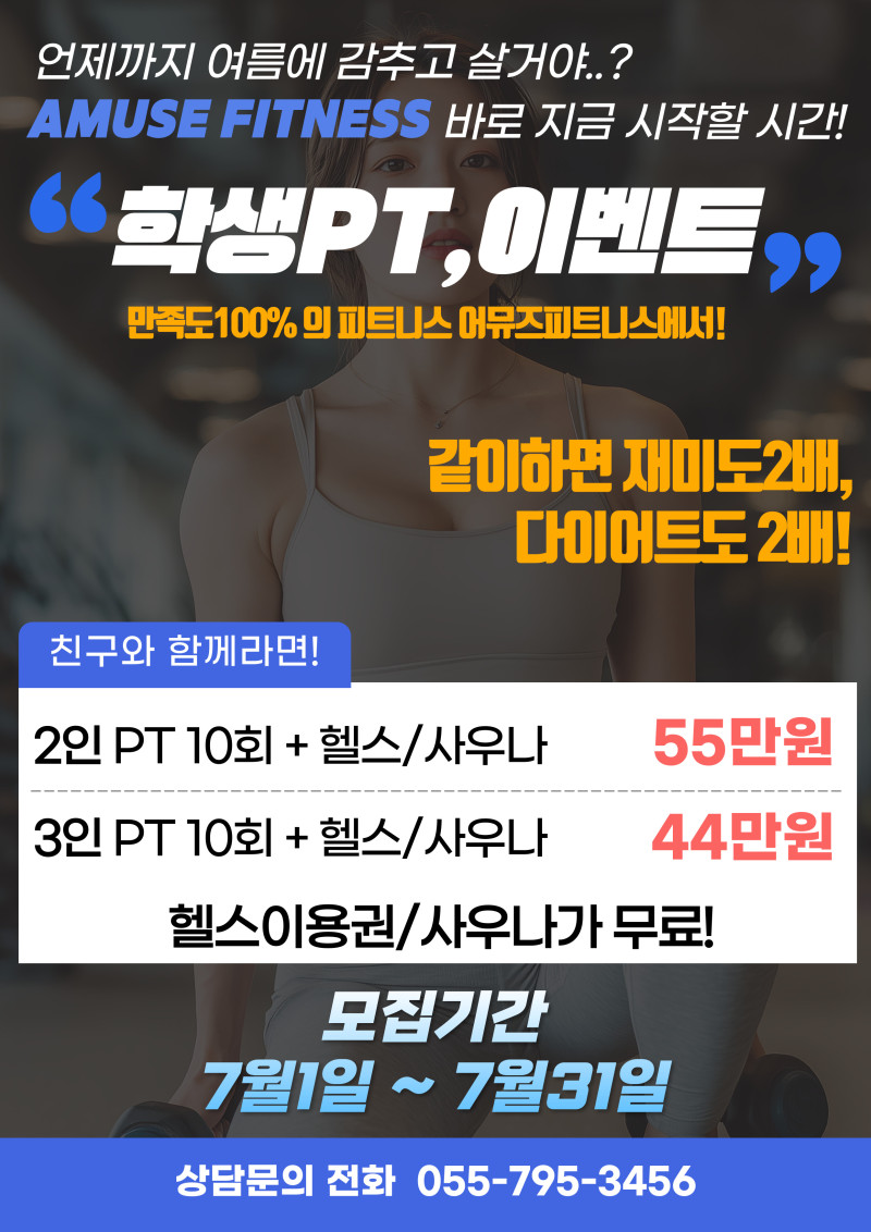 어뮤즈 피트니스에서 학생 PT 이벤트 진행중이니 많은 관심 부탁드립니다 !!