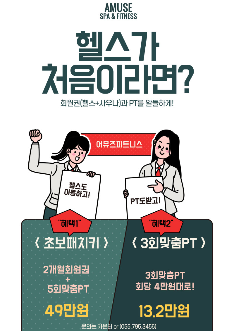 이 기회를 통해 헬스와 PT의 즐거움을 느껴보세요! 궁금하신 점은 언제든지 카운터에 문의하시거나 전화 주세요! ♥