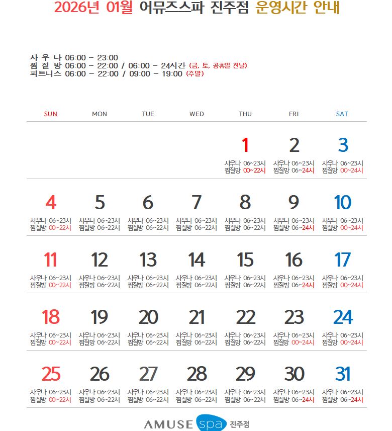 어뮤즈스파진주점 2026년 1월 운영시간표