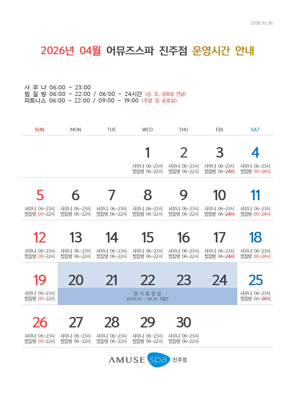 2026년 4월 어뮤즈스파진주점 운영시간 안내