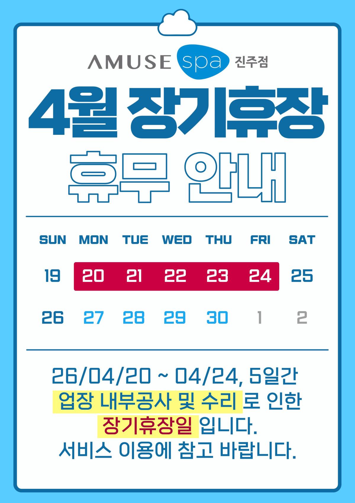 2026년 4월 어뮤즈스파진주점 장기휴장안내